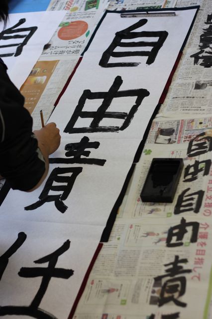 生徒達は、器用な人もそうでない人も新年の抱負を筆に込めて思い思いに紙の上に筆を滑らせます。