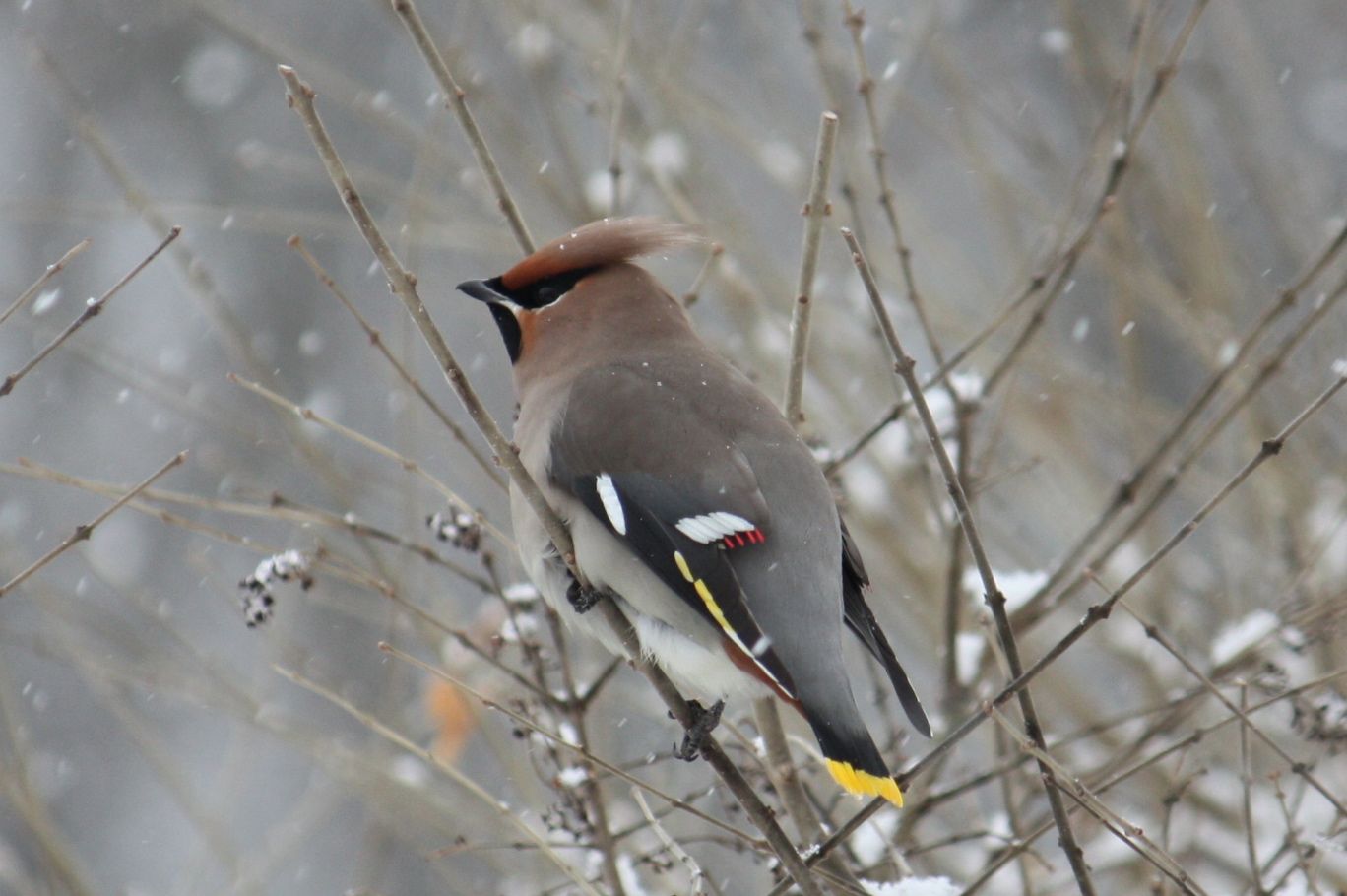 尾羽の先が黄色いのでキレンジャクです。同じ姿で尾羽の先が赤いヒレンジャクが来ることもあります。毎年この時期に集団で飛来し、2、3日すると姿を見かけなくなります。